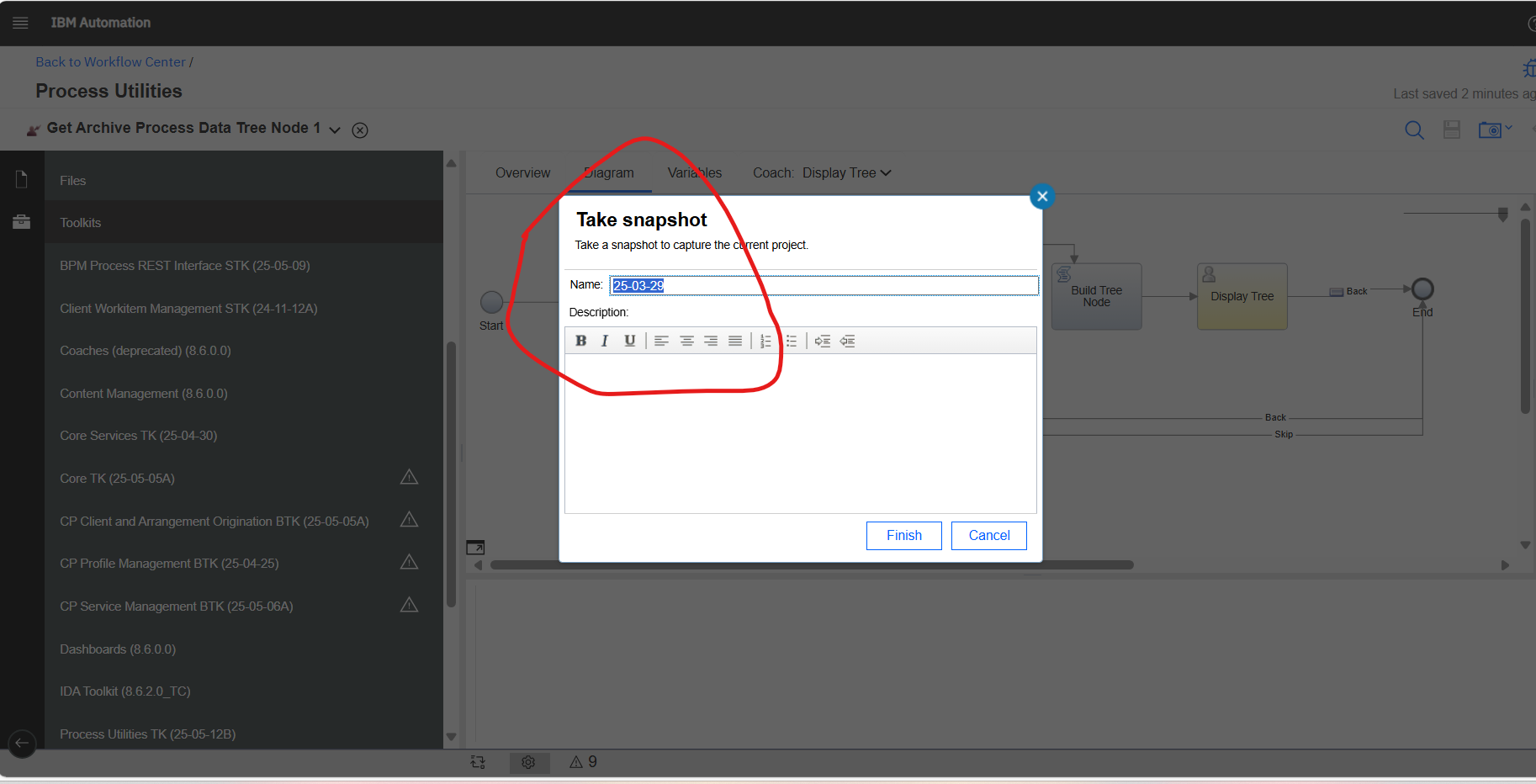 Currently, when creating snapshots in IBM BAW, users manually enter snapshot names. This can lead to: