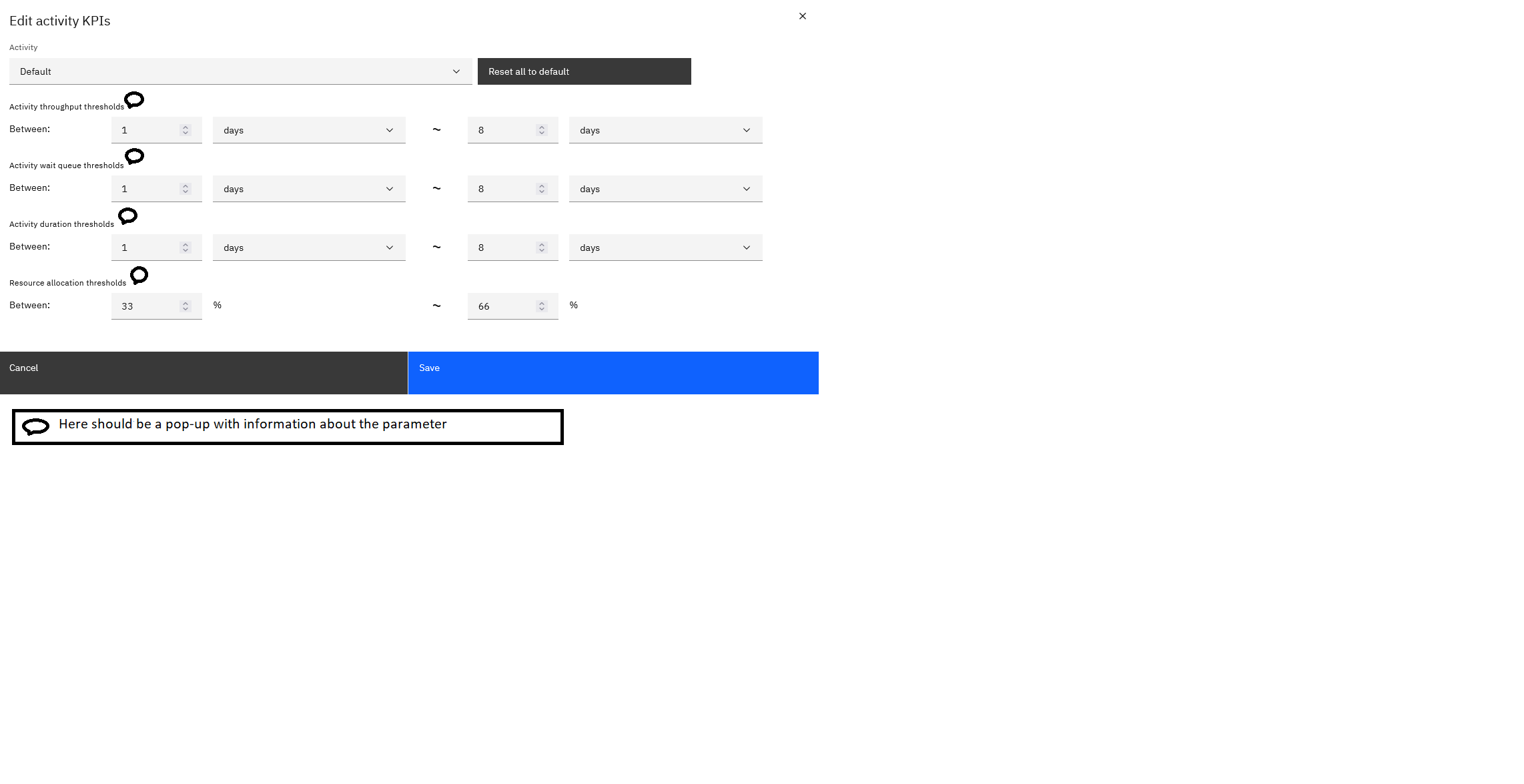 In the tab Data&Settings/KPIs/KPI benchmarks/Edit process KPIs or Edit activity KPIs are parameters: "Case duration thresholds", "Case cost thresholds", "Activity throughout thresholds", "Activity wait queue thresholds", "Activity duration thresholds", "Resource allocation thresholds". Each parameter should include an explanation/definition (for example, in the form of a pop-up window) of how it works (e.g. based on what data/relationships it is created) The problem is shown on the picture "Process mining - Activity KPI's - additional field with hint or explanation" and "Process mining - Process KPI's - additional field with hint or explanation"