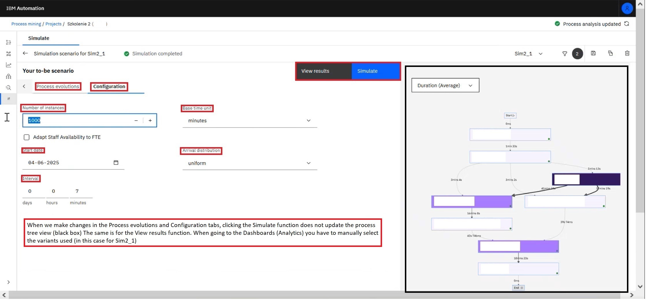 At the level of Your-to-be scenario making changes in the Process evolutions and Configuration tabs and applying the Simulate action, the process overview is not updated. The same problem is with the Dashboards (Analytics), which are not automatically updated after applying the Simulate function (you have to manually select the variants)