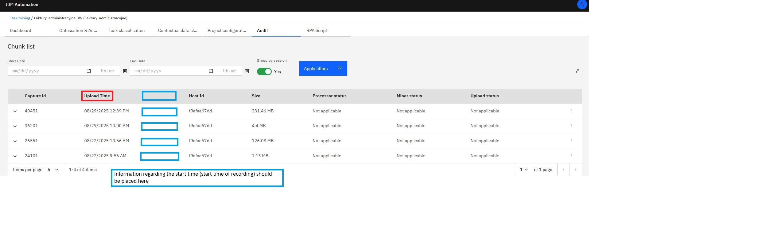 In the audit tab, in addition to the specified upload time (end of recording), the start time (start of recording) should also be included.